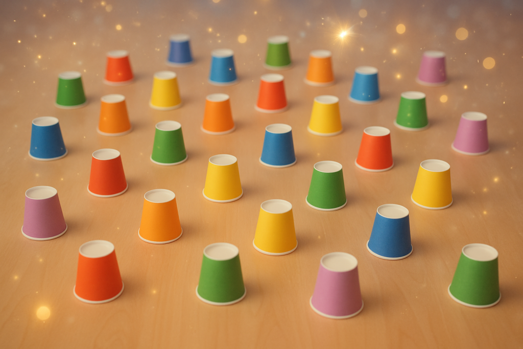 Ich hab ganz viele bunte Becher verteilt – wie ein kleines Wichtelrätsel.